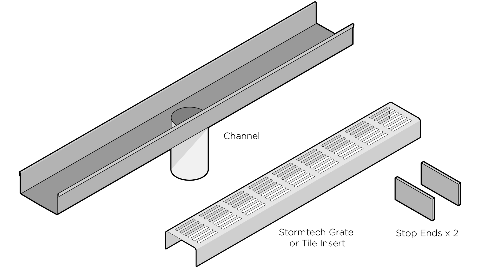 Stormtech Modular Kits are supplied with grate and oversized channel to be cut down on site. One piece channel comes with pre punched spigot with outlet extender (kits up to 2000mm long). Oversized channel enables choice of outlet positions: centre, end or wherever preferred. Kits over 2000mm long and kits requiring multiple outlets are supplied with outlet on joiner plate. All kits are supplied with 2x clip-on end caps.